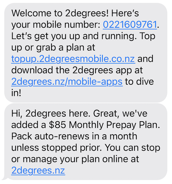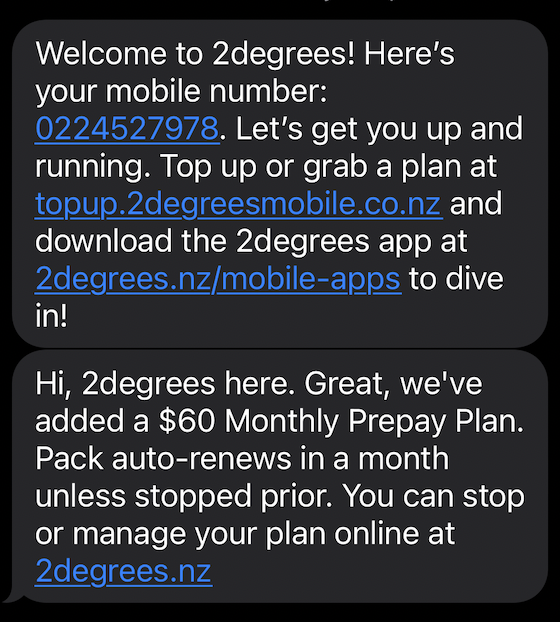 - The 1st text is will say Welcome to 2degrees and it will include your assigned NZ mobile number beginning with 02.
